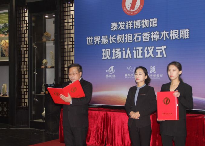 世界纪录协会高级认证官张健先生进行现场认证,经过前期严格审评、数据分析比较及现场认证,张健先生宣布:鄂尔多斯泰发祥博物馆2014年至2016年组织制作并收藏的树抱石香樟木根雕《万里长城永不倒》,总长度为32.93米、平均高度为2.79米,创“世界上最长的树抱石香樟木根雕”世界纪录成功。